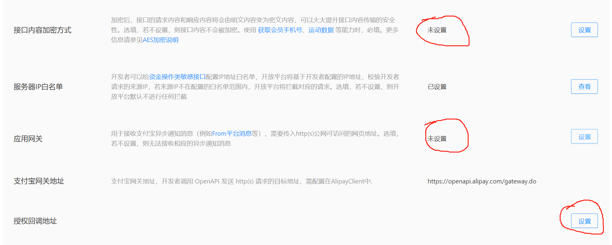 支付宝支付设置时,支付宝开发平台-开发设置中,有如图三个设置选项,配置文档中没有提到这三个设置,请问能否设置?