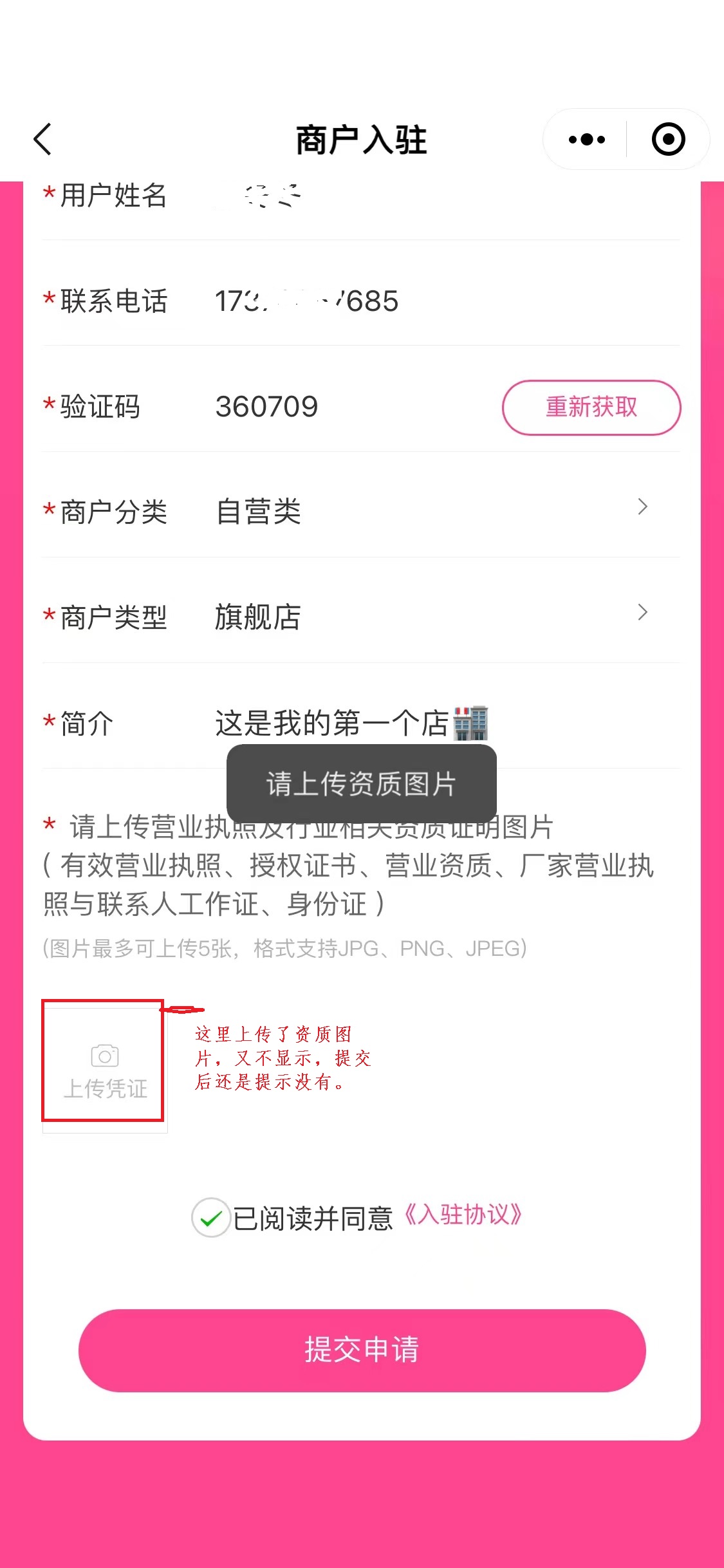 商户入驻提交不了申请,在上传凭证那里上传了,也提示没用。