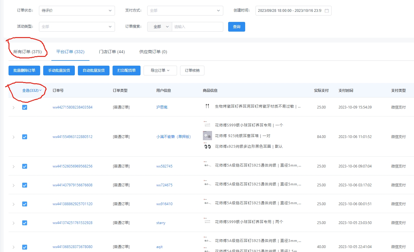 订单导出 的不是选中的 而是所有订单,图中选中的是332,导出以后是375