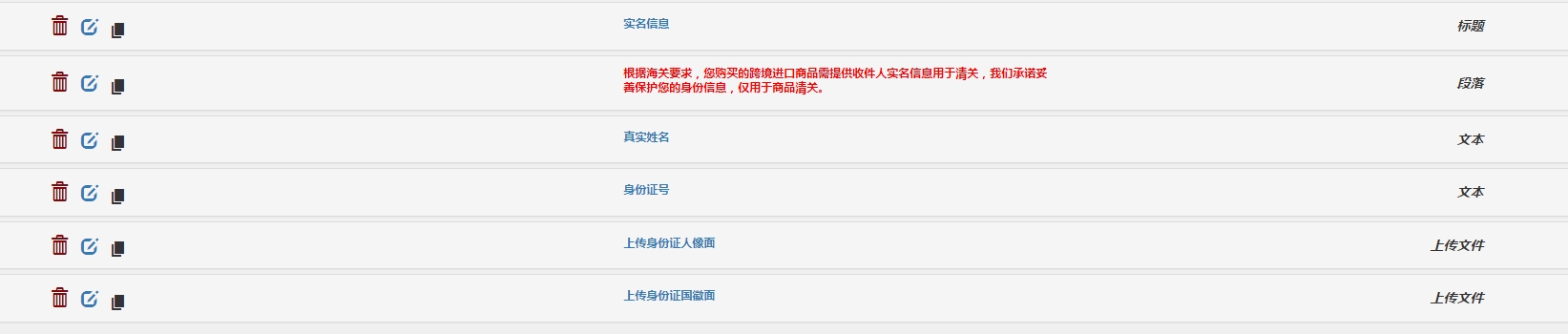 建议可以增加一个实名购物的开关选项,如果开启,可以要求客户填写真实姓名、身份证号以及身份证正反图片,进口的电商有这个特殊需求。