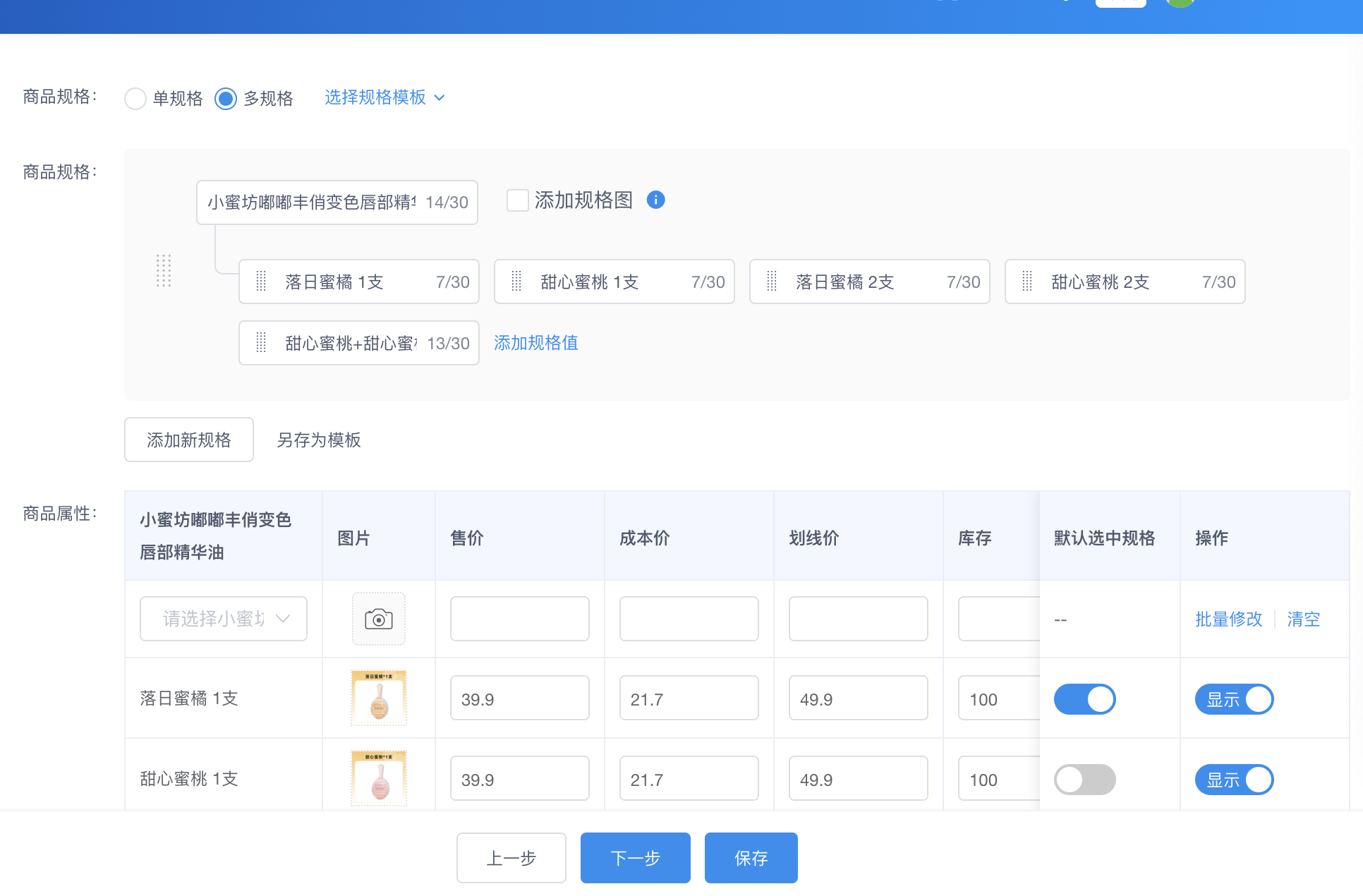 pro3.4设置商品多规格时,进来页面显示售寝,也选择了默认,麻烦帮我看下。