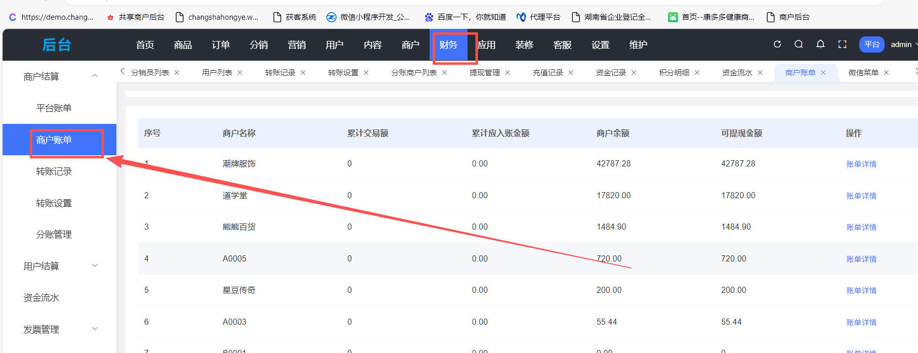 多商户清理数据库测试内容里,这个里面财务里面的商家结算-商家账单是清理数据库里面的内容,请帮我指明一下,是哪个数据库字段要清理才可能清掉这个内容