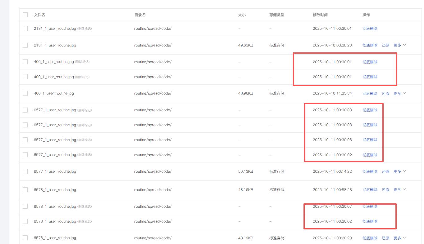 对接了腾讯云云存储 这个路径routine/spread/code/276_1_user_routine.jpg 今天有用户发现海报给新用户扫被绑定成其他人了,就检查了下数据库 发现我们数据库里有200多条海报记录,然后去查看腾讯云那边只有二十多条,仔细看了下都是之前零零散散时间生成的海报图片,然后11.30的时候开启了腾讯云的回收站,后面看了下回收站发现在00.30的时候自动进行了删除图片