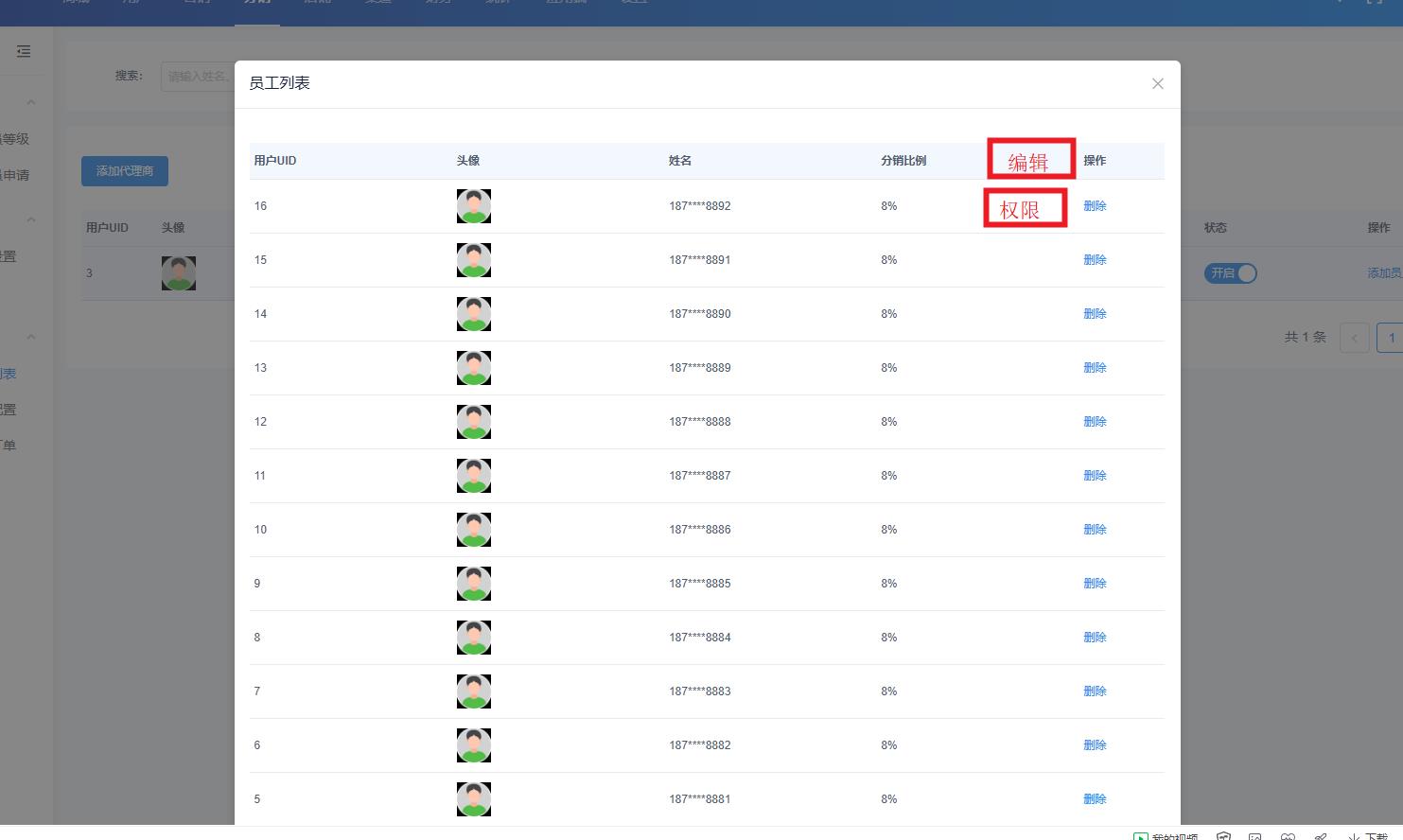 希望在PRO版本里 后台分销--团队分销---代理列表---员工列表---增加编辑权限的功能,可以设置是否开启员工可以员工可以查看自己的下级用户的:用户名,手机号,暂未返佣,下单次数,订单编号,购买的商品名称及数量,下单时间 物流配送信息,方便员工管理维护自己用户的下单售后情况!当员工A下线所有推广的人,点击咨询客服的时候,可以直接员工A就更好了!