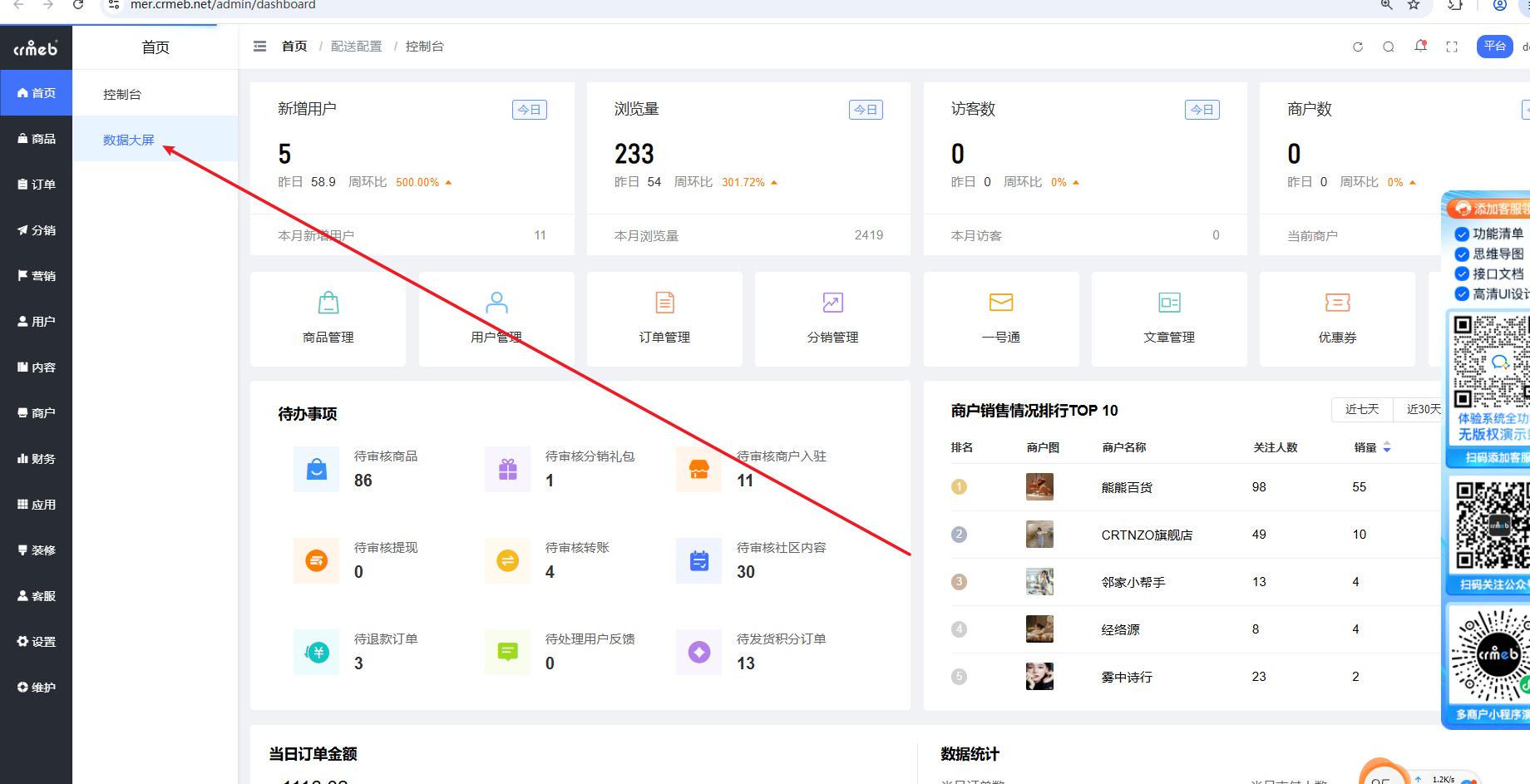 在平台端如何添加一个按钮 用于网页的跳转,我们自己开发了一个数据大屏,假设页面是https://baidu.com,如何将这个域名设计到我的平台里面,就是咱们php的 首页的数据大屏