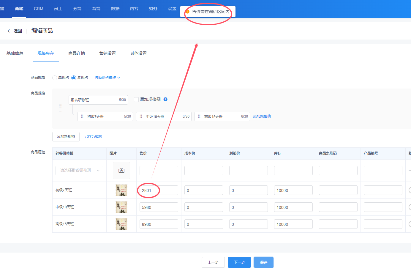 商品多规格调整价格时显示:从2800元调整时显示售价需在调价区间内,但是找不到其他条件的地方