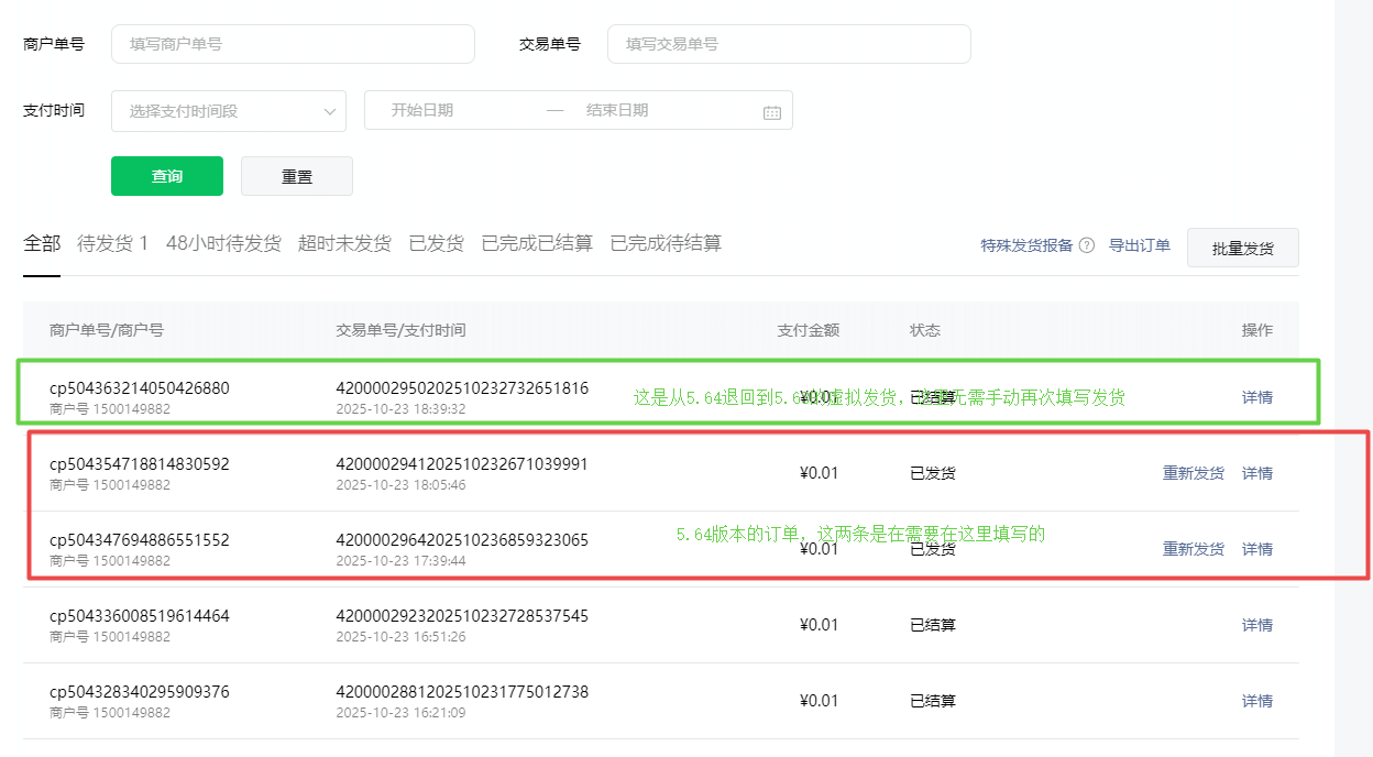 前面的帖子因为填写了path的导致不能自动流程,后根据大佬的建议排查已经处理OK,再次升级到5.64,不管是虚拟商品发货,还是实物,都需要到小程序平台填写发货信息,相当于多了一个流程,但是5.63没有这个问题,下图中,红色框中标示的为5.64的虚拟发货,后台点了发货后,必须到小程序的订单管理--发货信息录入里再次点发货,然后根据情况填写发货的是实物或者是虚拟发货,下图中的绿色框中标示的是从5.64退回到5.63,后台点了发货,小程序平台的订单管理处就自动完成结算,希望各位大佬复盘研究一下下!