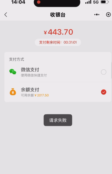 买家使用余额支付时,一直转圈圈,转一会儿后就显示请求失败