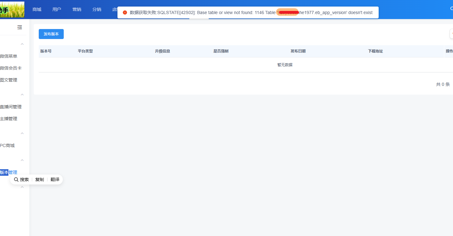 pro版本升级3.5后 数据获取失败:SQLSTATE[42S02]: Base table or view not found: 1146 Table 'yedanhe.eb_app_version' doesn't exist