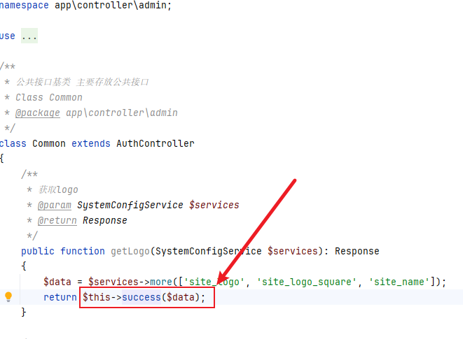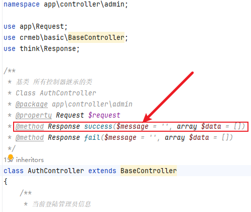 @method Response success($message = '', array $data = [])但是没有实现代码, 还是说具体实现在加密文件BaseController.php中