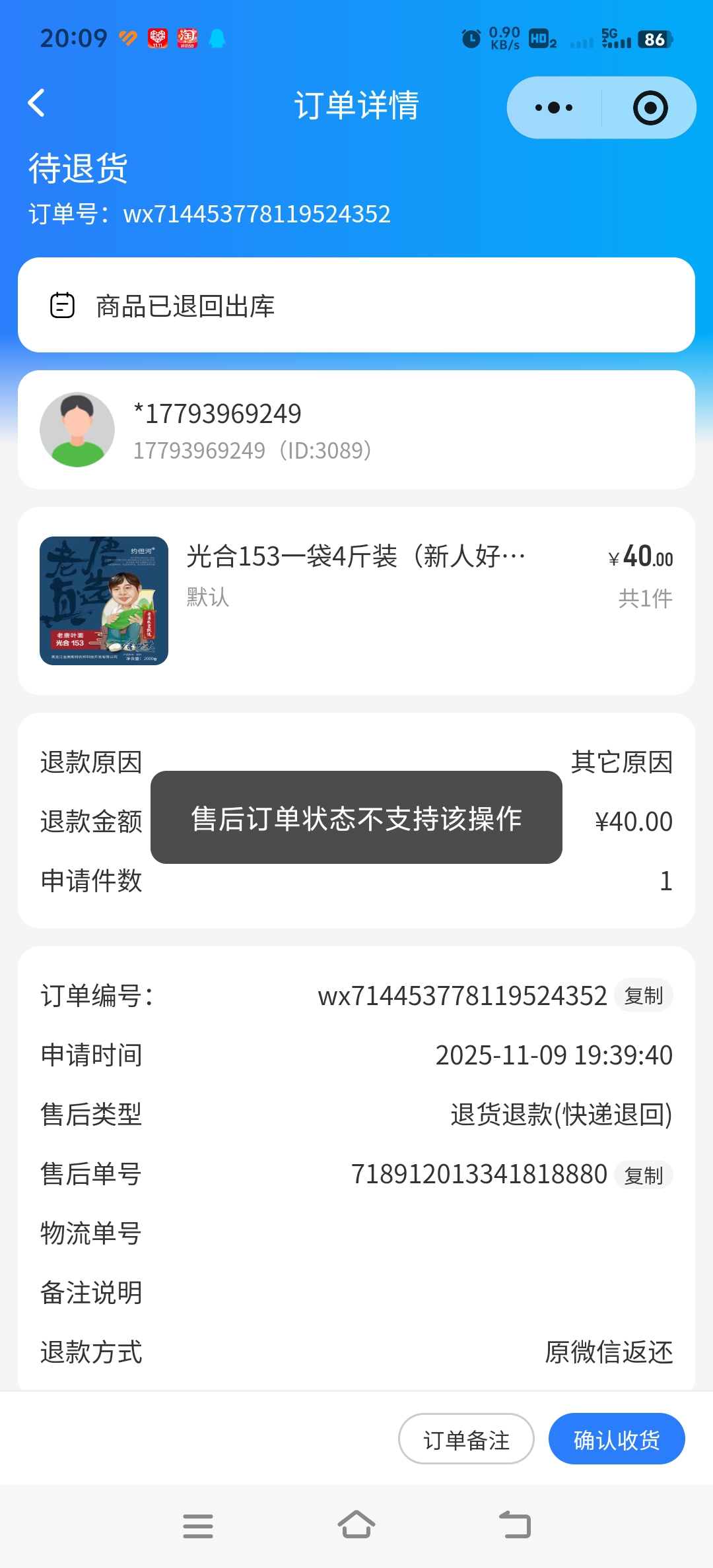 客户产品不喜欢,把货物退回来了,这边点击确认收货,售后退款,确认不了!