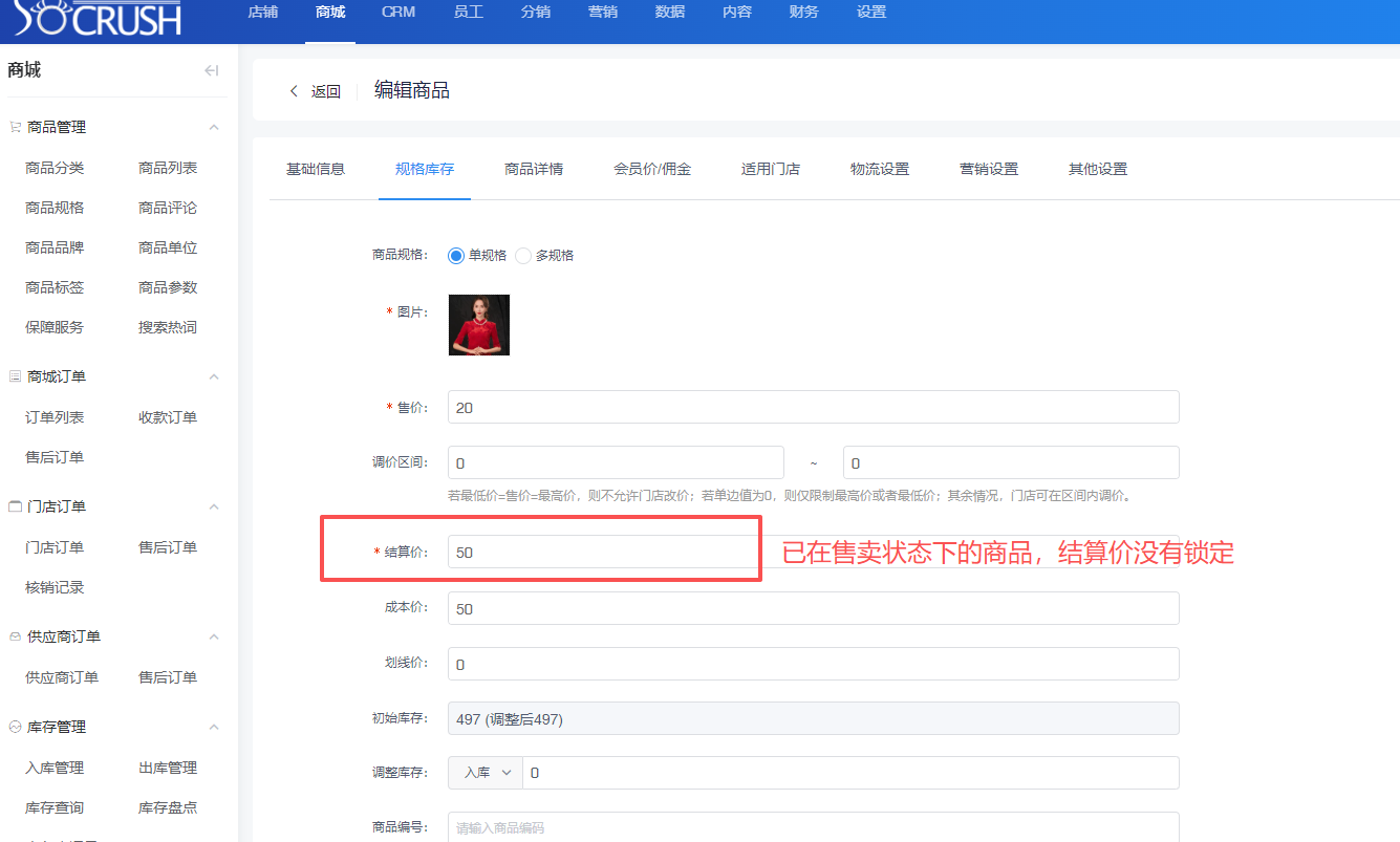 2、平台端修改商品资料,还是可以修改供应商的结算价,且供应商端没有任何提示。上一版就已经提过,平台可以随意修改供应商结算价,这个会引起很大的商业纠纷。看到在平台端把库存锁定了,结算价确没有锁定。
