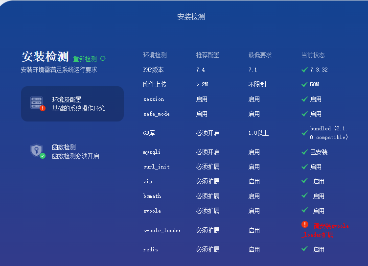 安装时提示安装扩展,使用内置的脚本检测,扩展有时存在的。这里为啥要重装。因为php7.4.33版本运行swoole时,提示host miss