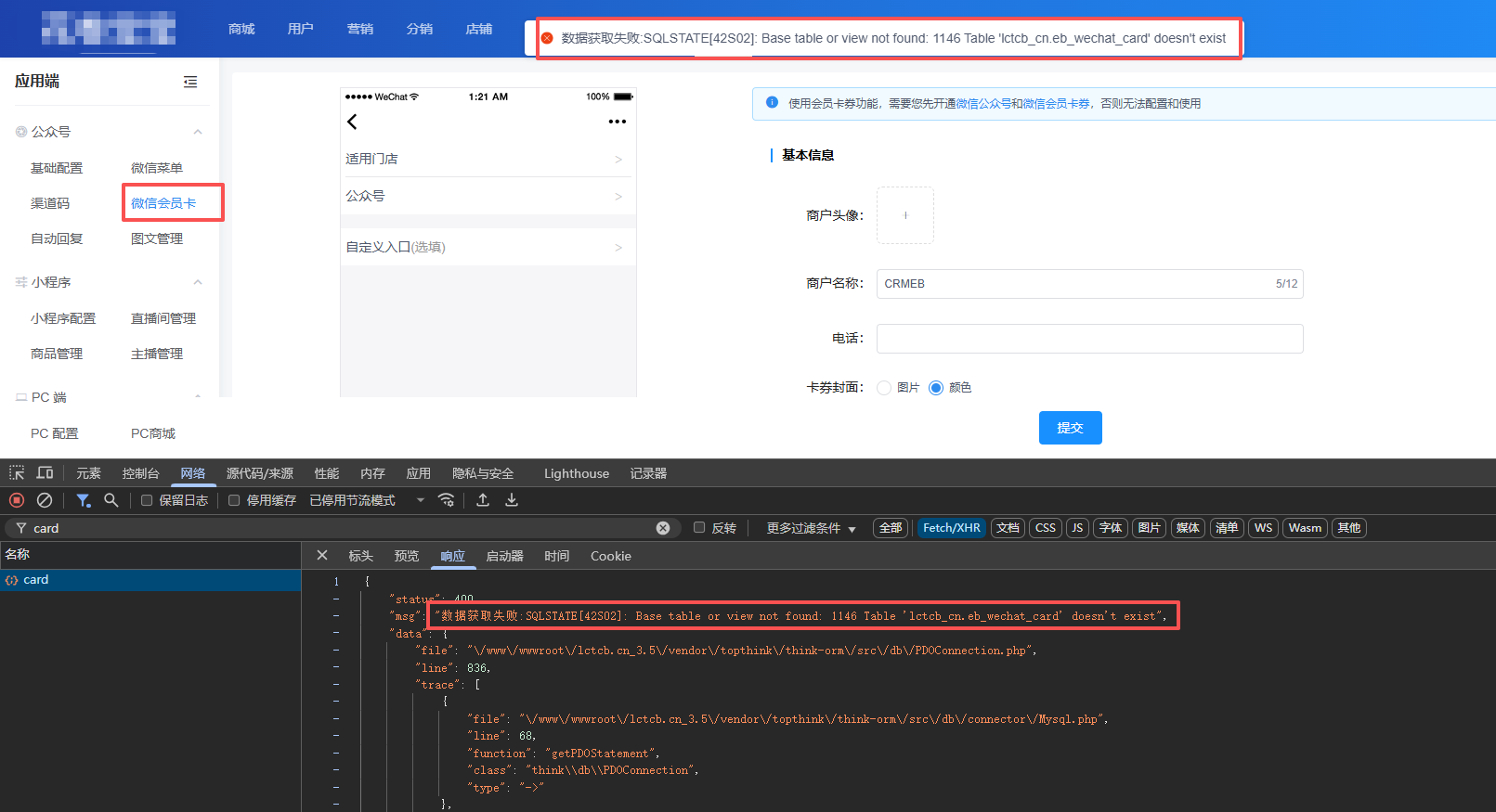 升级到pro3.5之后 后台微信会员卡点击之后报错, 如下图