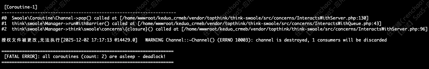 授权文件被更改,无法执行[2025-12-02 17:17:13 @14429.0] WARNING Channel::~Channel() (ERRNO 10003): channel is destroyed, 1 consumers will be discarded