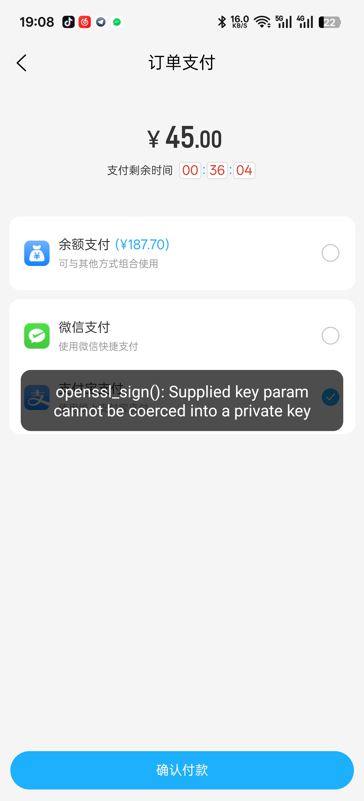 APP已经打包好了,开放平台移动应用APPID和AppSecret均已配置完成,且微信APP支付也已经开通,下午打包好APP之后进行支付测试,微信支付一直提示支付失败,支付宝支付偶尔会成功,偶尔出现openssl_sign():supplied key param cannot be coerced into a private key,请问这是什么原因造成的,怎么解决,感谢各位~