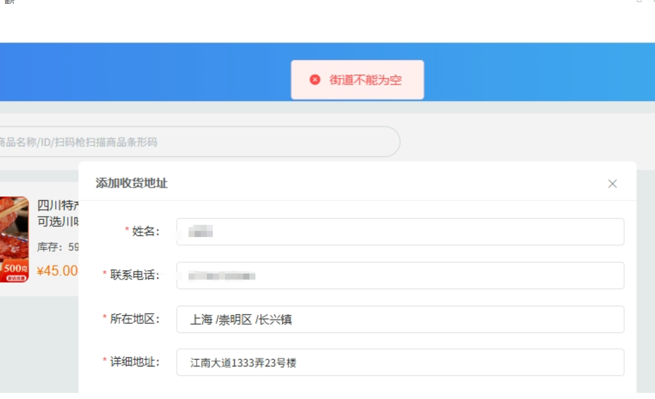 代客下单功能:添加收货地址已经选到了镇,点击确认,提示街道不能为空。