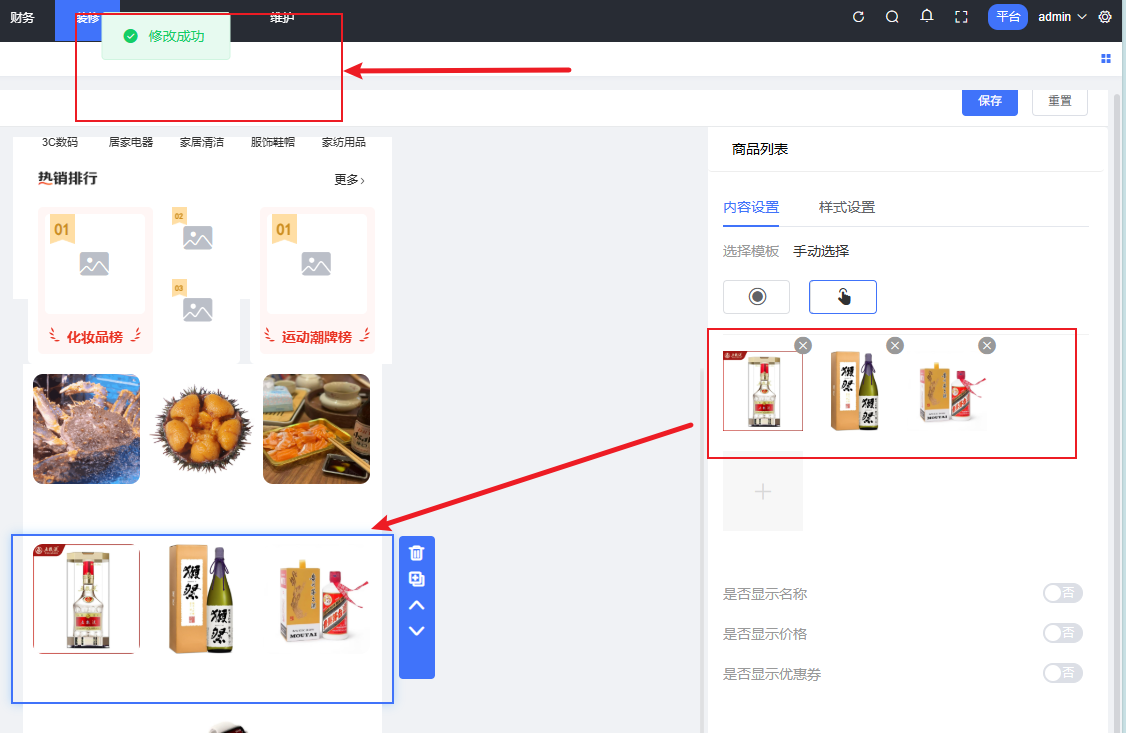 再后台进行装修的时候,我把商品的展示顺序按照如下所示的方式进行展示的也保存成功了,小程序的展示顺序却和装修的展示顺序不一样。这是什么原因?如何修改?