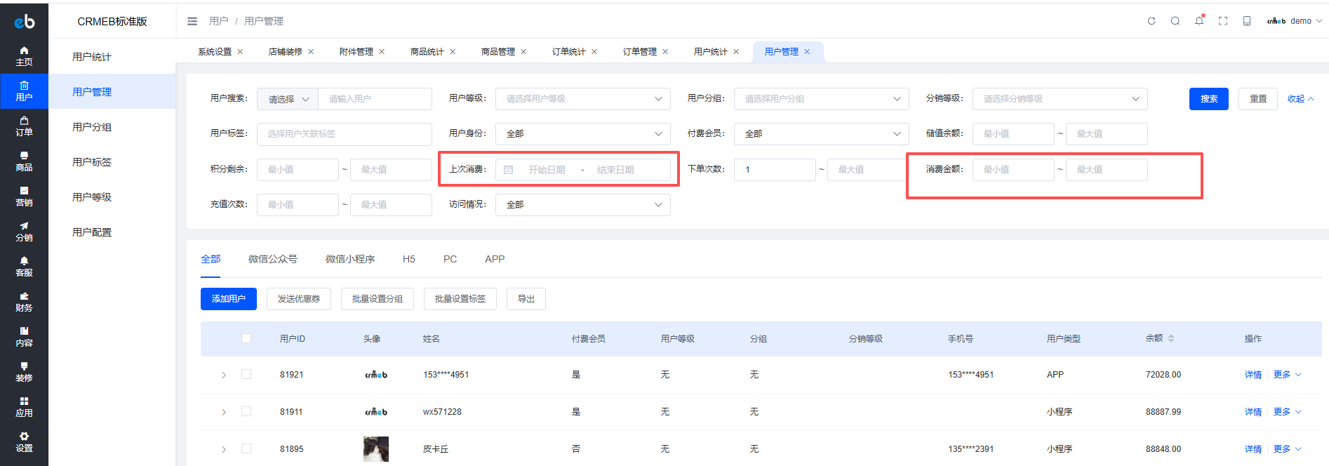 这俩功能,不管填什么筛选条件,都不起作用,筛选出来的都是全部的用户。