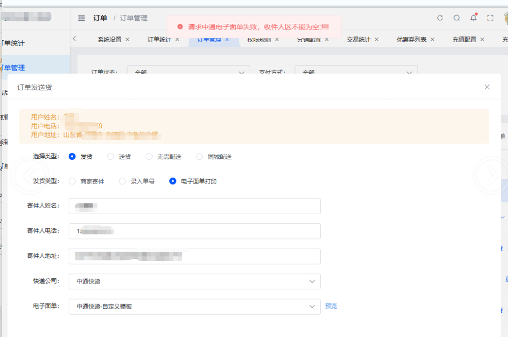 - "请求中通电子面单失败,收件人区不能为空;!!!!"不换模板,点发货,有时候提示余额不足,有时候提示收件人为空。