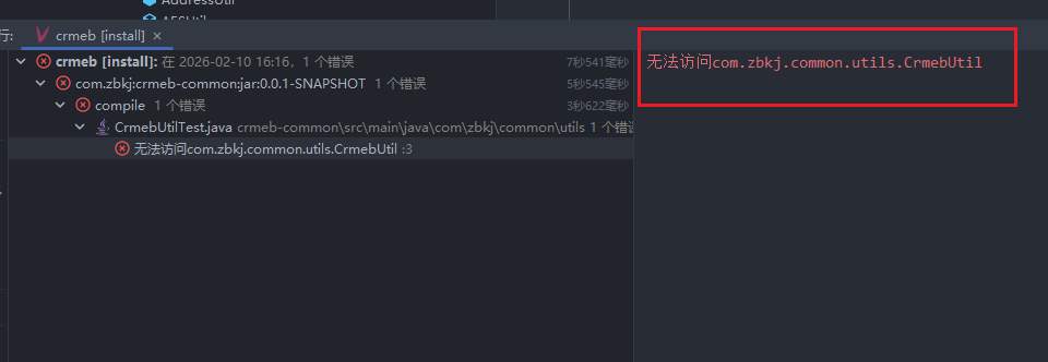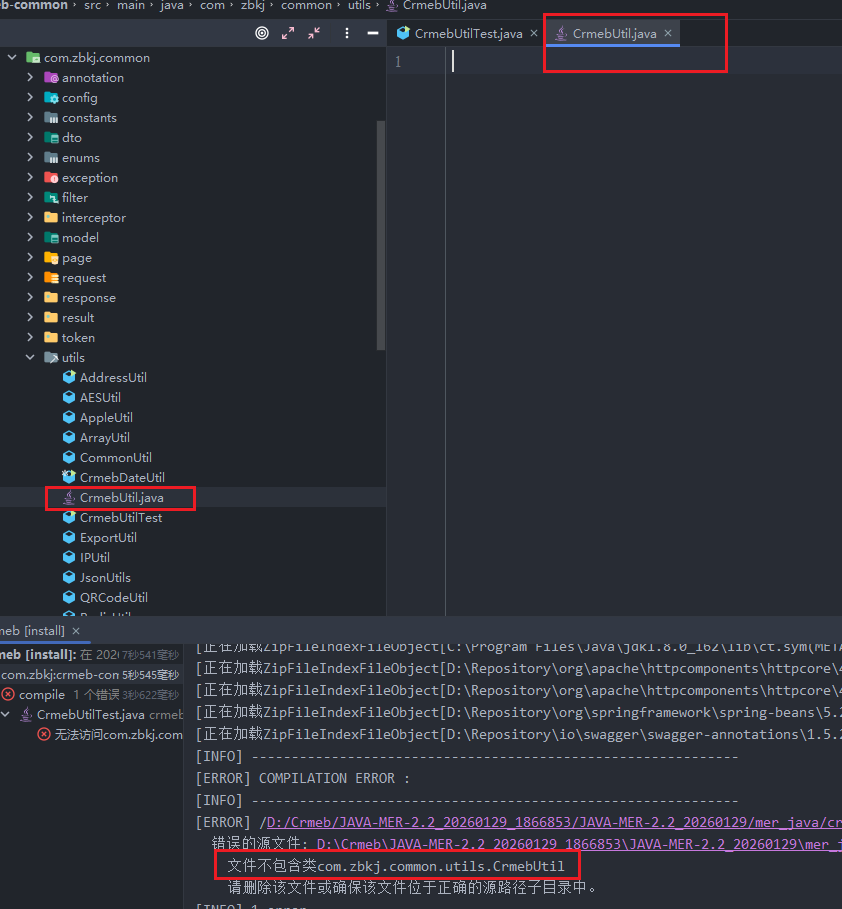 在准备打包时按教程先Maven clean install,结果在install步骤报错,如图,我点开CrmebUtil.class是空白的,请问是什么问题?怎么解决