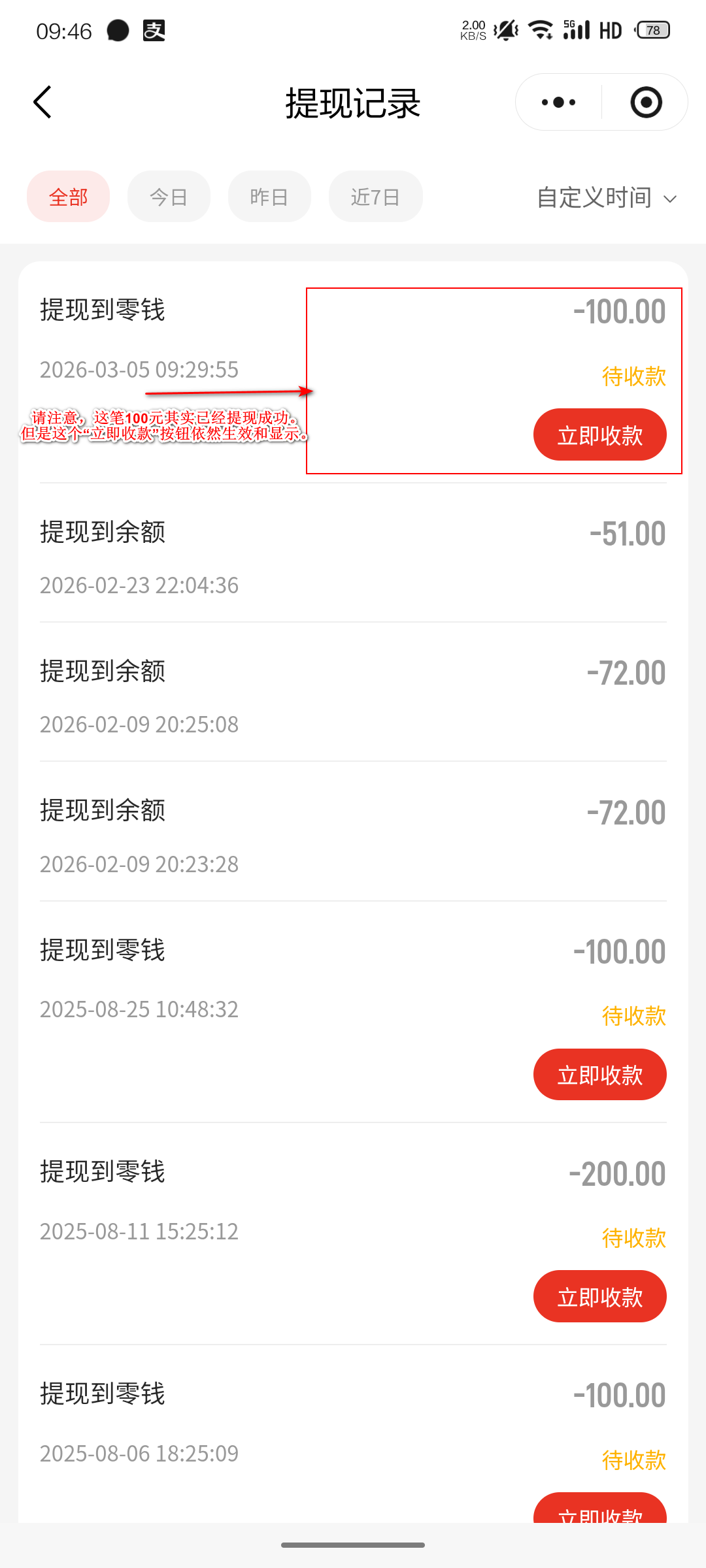 之前反映过体现列表,对于已经体现成功的记录,依然会显示“立即收款”按钮,但是点击后是会提示订单失效的。