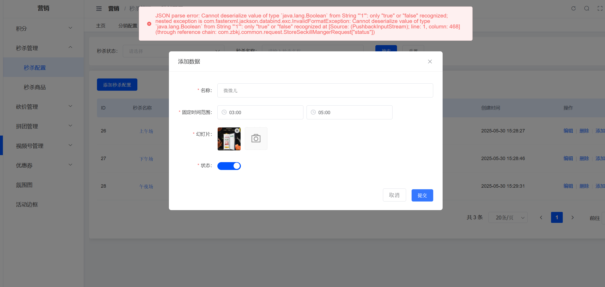 单商户2.4版本添加秒杀配置报错了,该如何修复................