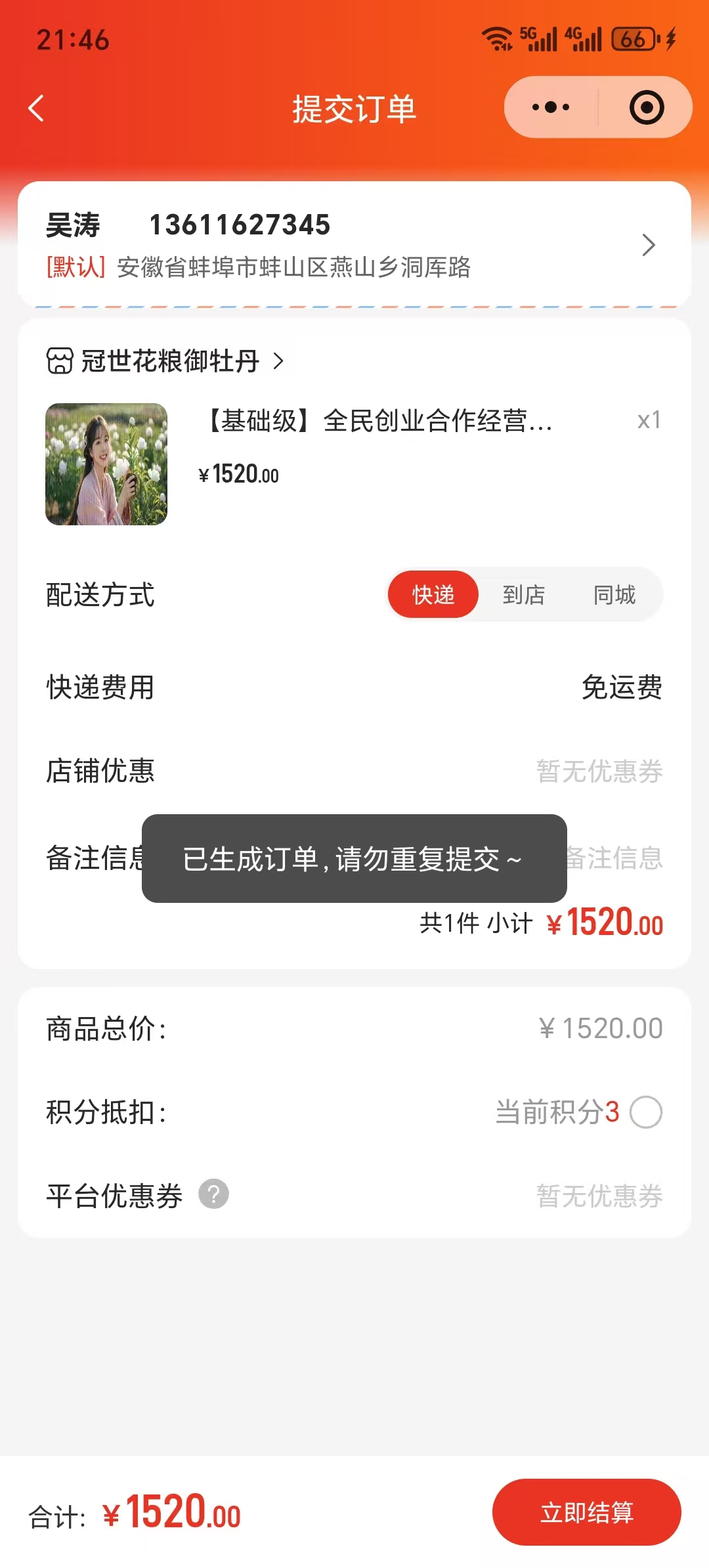 点击立即支付后提示:“已生成订单,请勿重复提交~”;这个是以前提交过及清算未支付完成,现在 我的订单>待付款中。建议这里直接跳转到 待付款的页面或提示(我去支付 按钮点击后跳转)是否到到支付订单,而不是简单给个提示,这样用户并不知道需要到 待支付 订单里去支付,大大影响了用户的体验。