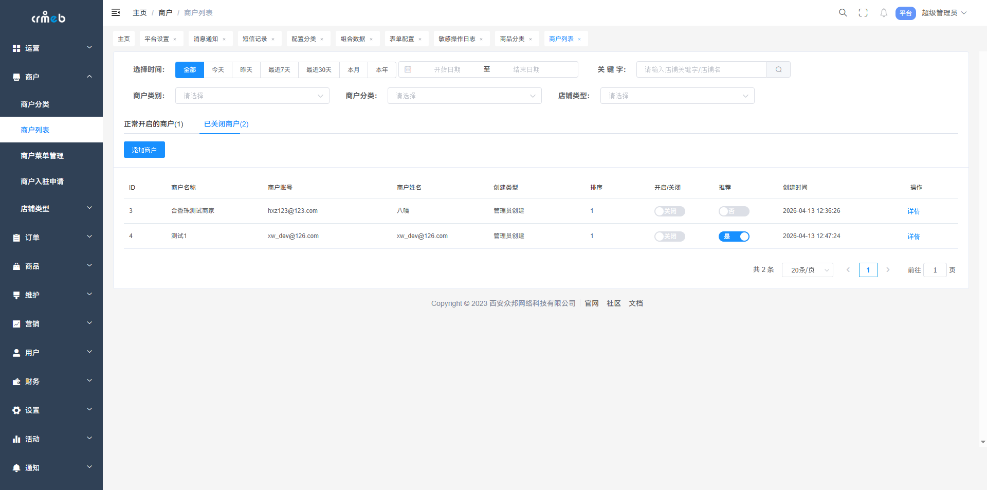 现在已经可以正常访问  但是创建商户的时候 无法收到密码和开启的时候一直报错