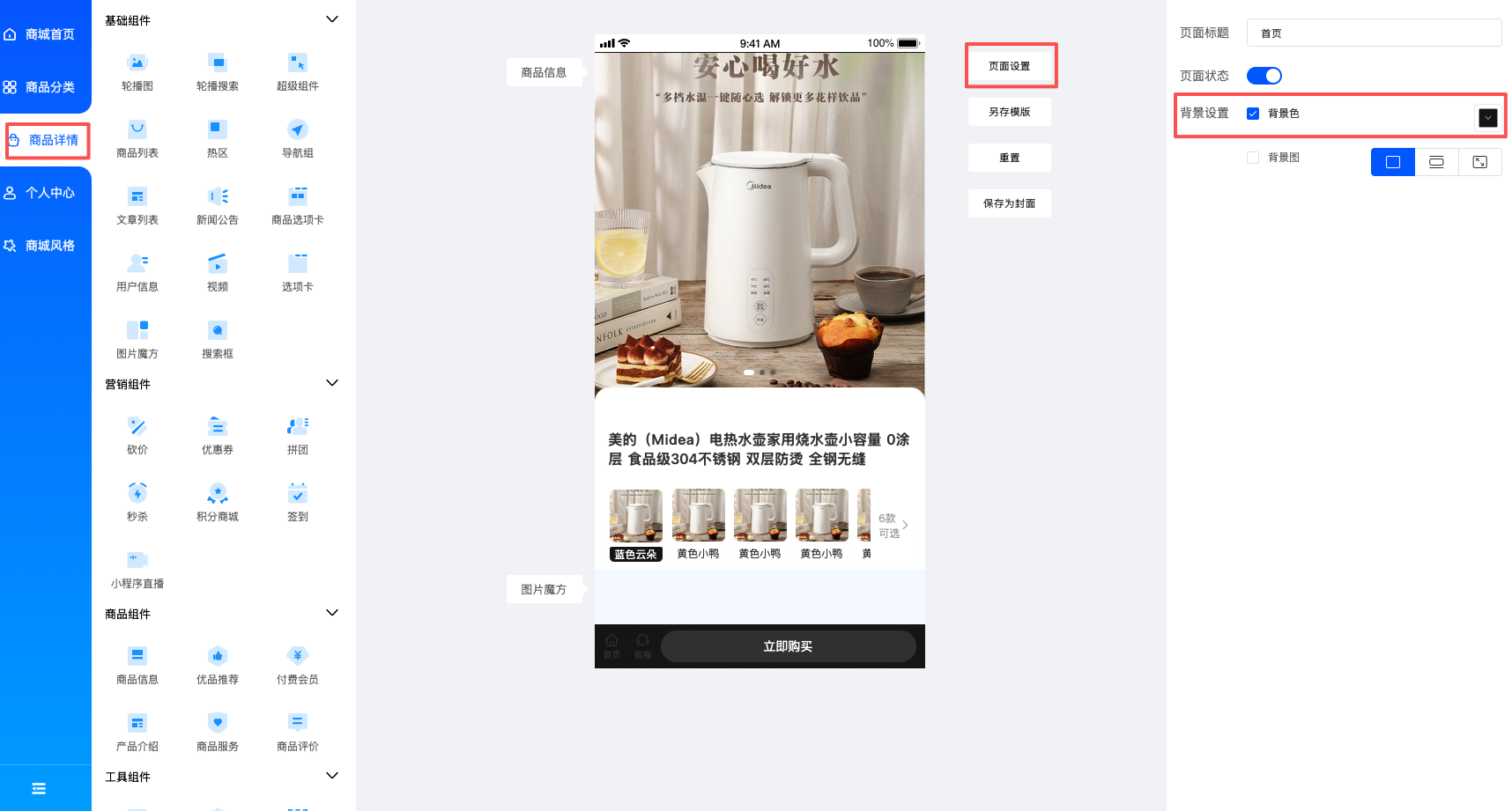 装修功能,主题设置内,商品详情页设置了背景颜色后不生效,实际显示为灰色,增加空白模块设置黑色背景模块背景颜色生效,页面背景颜色不生效