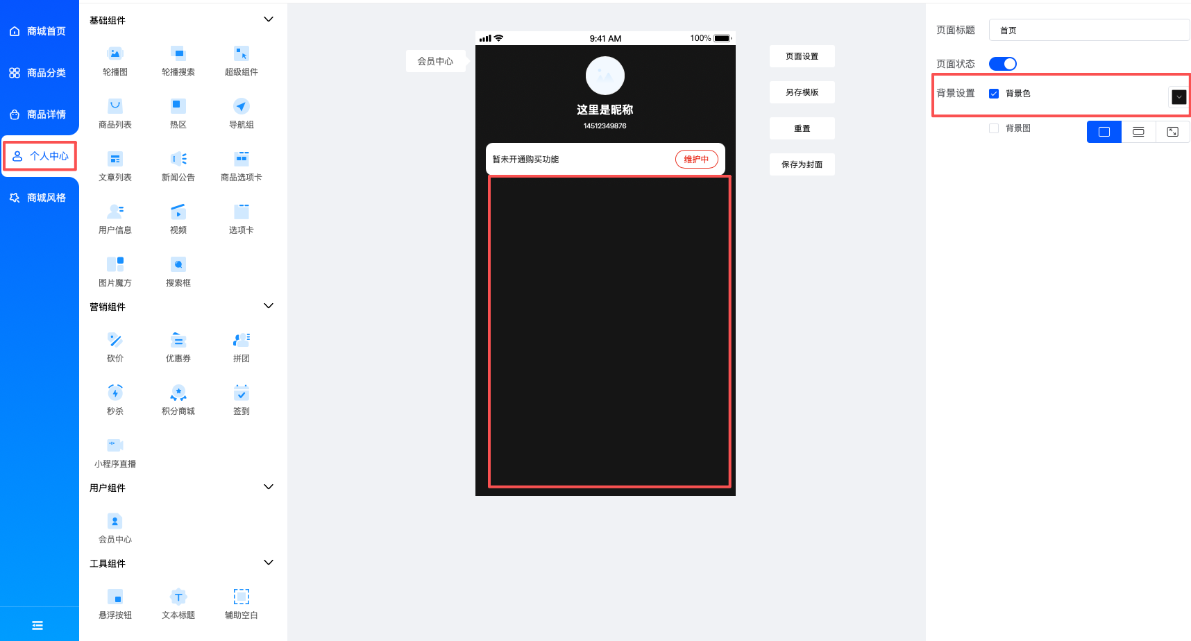 装修功能,主题设置内,个人中心页设置了背景颜色后不生效,实际显示为灰色,增加空白模块设置黑色背景模块背景颜色生效,页面背景颜色不生效