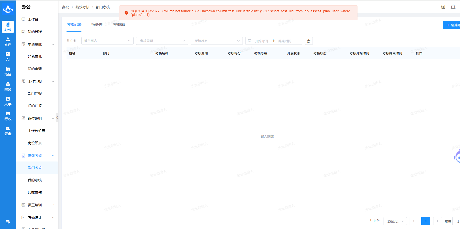 陀螺匠办公里面 绩效管理 -部门管理报错,表 eb_assess_plan_user里没有 test_uid这一列,但代码却试图查询它。是不是 文档里的SQL脚本字段不齐全,这个要怎么解决呢