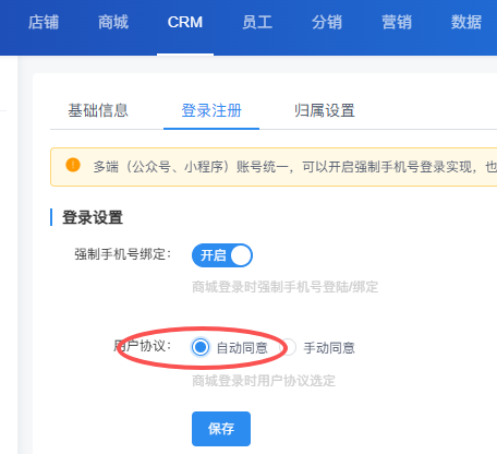 当后台设置用户协议手动同意时,前端的下方协议按钮才能勾选。