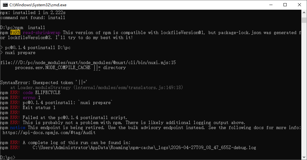 npm ERR! pc@0.1.4 postinstall: `nuxi prepare`