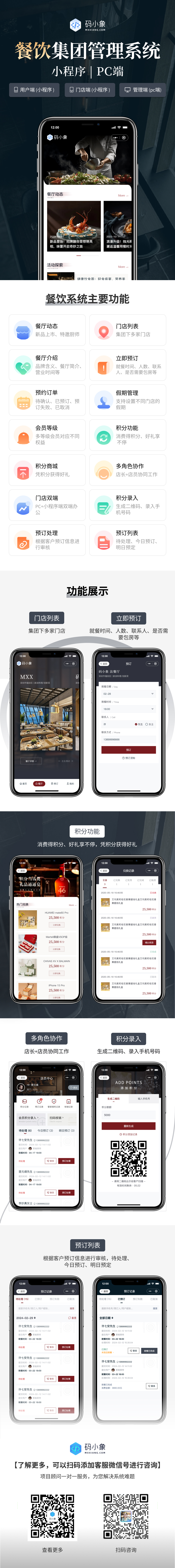 产品简介:针对高端餐厅预约场景使用,可线上预订就餐,门店预订确认。系统可进行会员积分,具备积分商城。