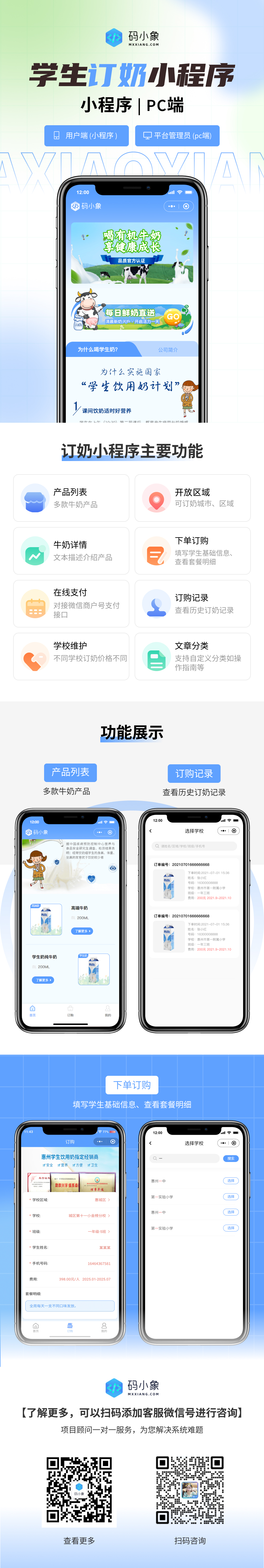 学生订奶小程序/学校订奶系统-定价按校区分-学校班级管理-牛奶详情介绍-线上支付订奶
