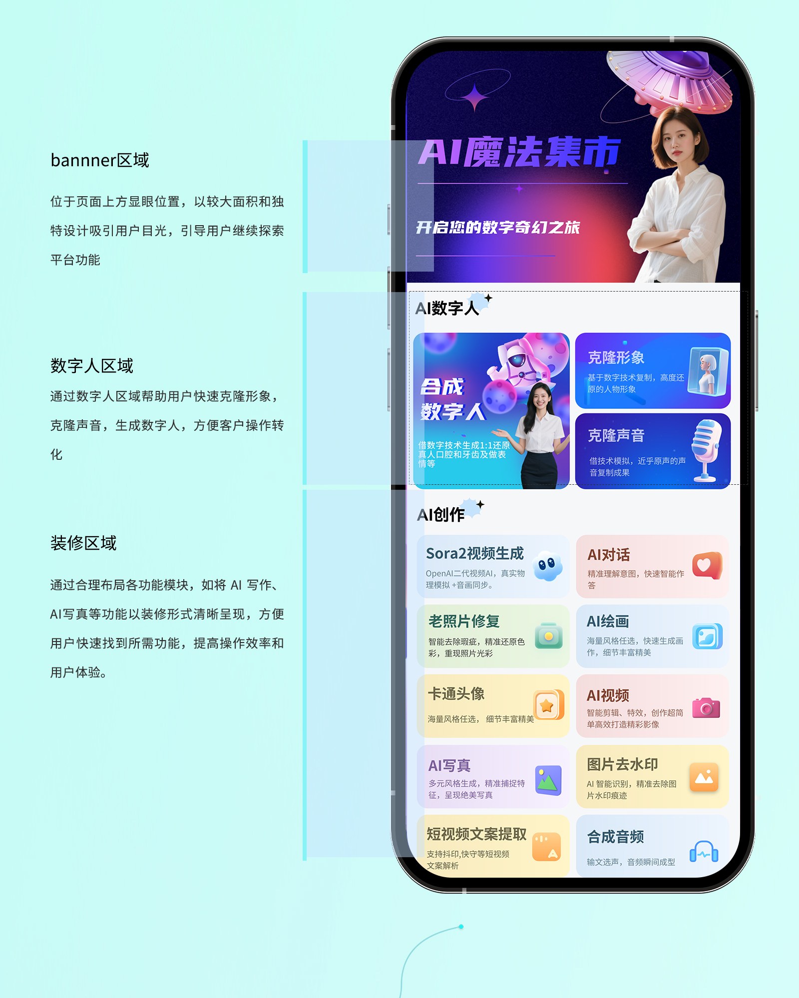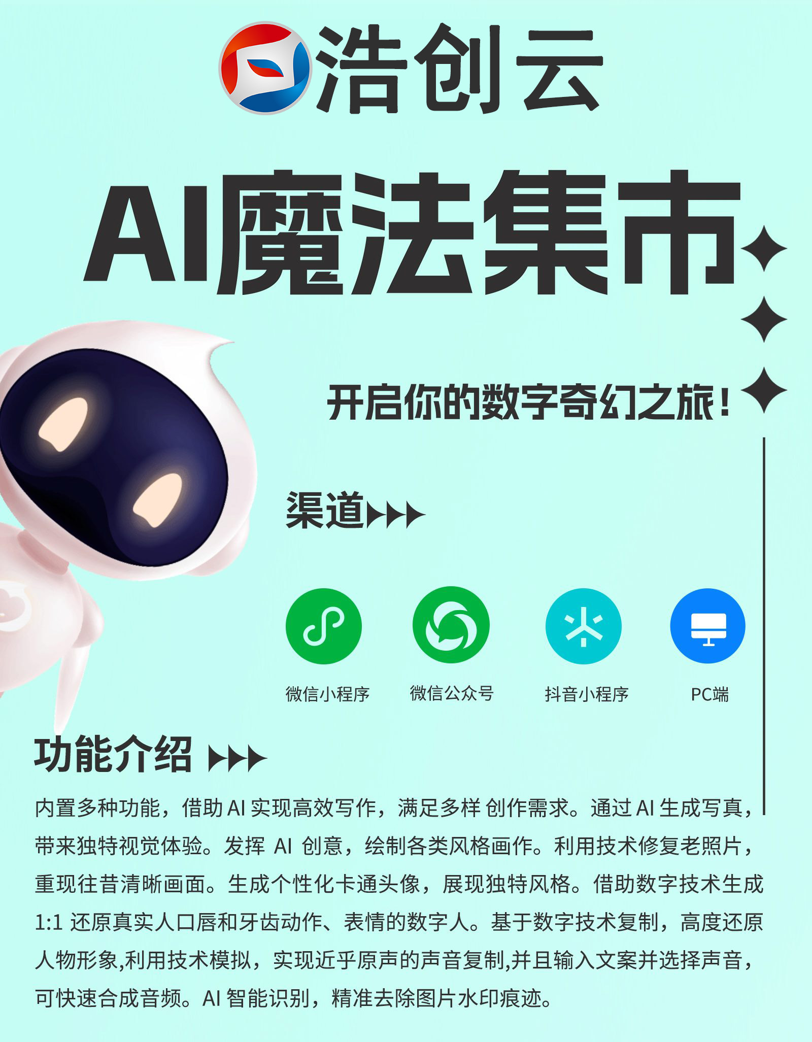 内置多种功能,借助AI实现高效写作,满足多样创作需求。通过A1生成写真,带来独特视觉体验。发挥AI创意,绘制各类风格画作。利用技术修复老照片,重现往昔清晰画面。生成个性化卡通头像,展现独特风格。