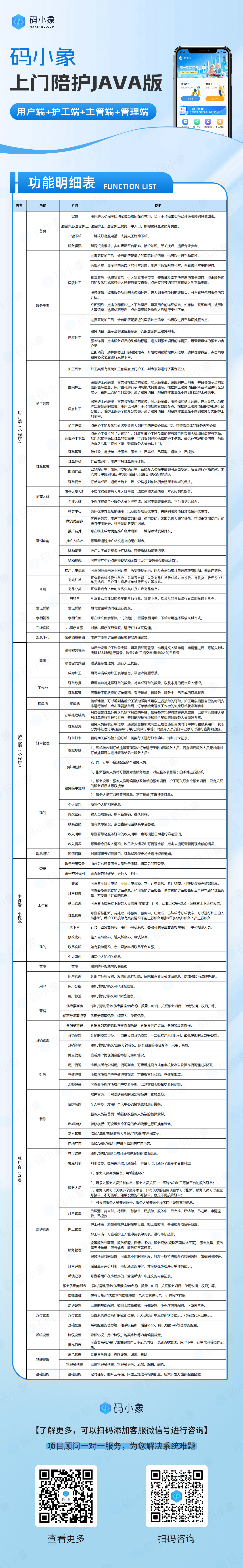 产品简介:码小象陪护系统源码JAVA版,包含陪护人员端,主管端,便捷的预约管理。产品级开发,开发者文档齐全,便于二开
