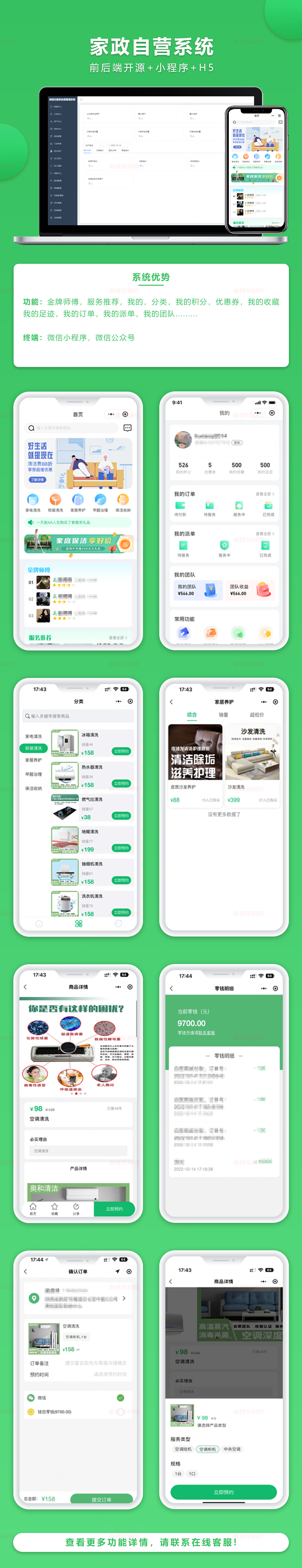 本系统开发使用JAVA技术栈开发,有客户运营案例,支持团长模式,员工派单,员工调度,线上一站式服务,支持员工开始服务结束服务上传图片内容等,可以应用到涉及的服务,比如上门洗车,对接消息通知所有模块消息通知,开源交付支持二次开发,商业使用或者二次开发均可,方便所有上门预约服务类。系统使用uniapp技术栈 支持微信小程序