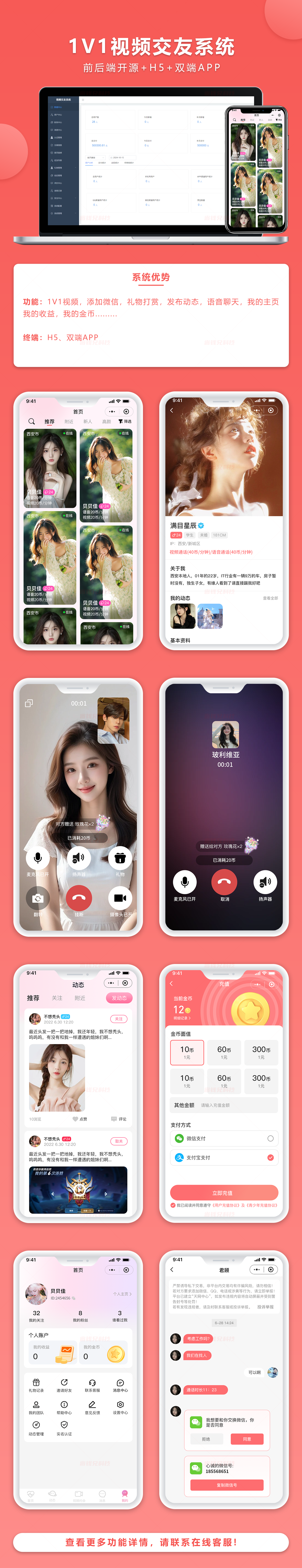 一对一视频、添加微信、礼物打赏