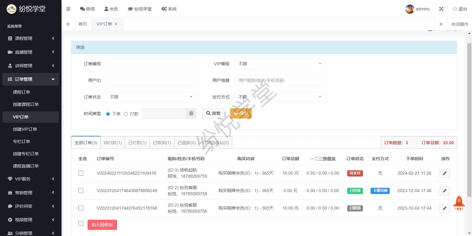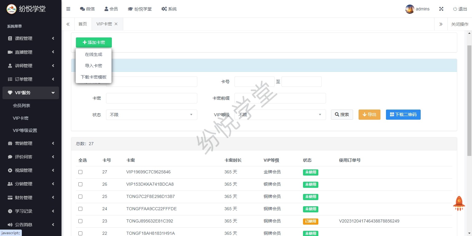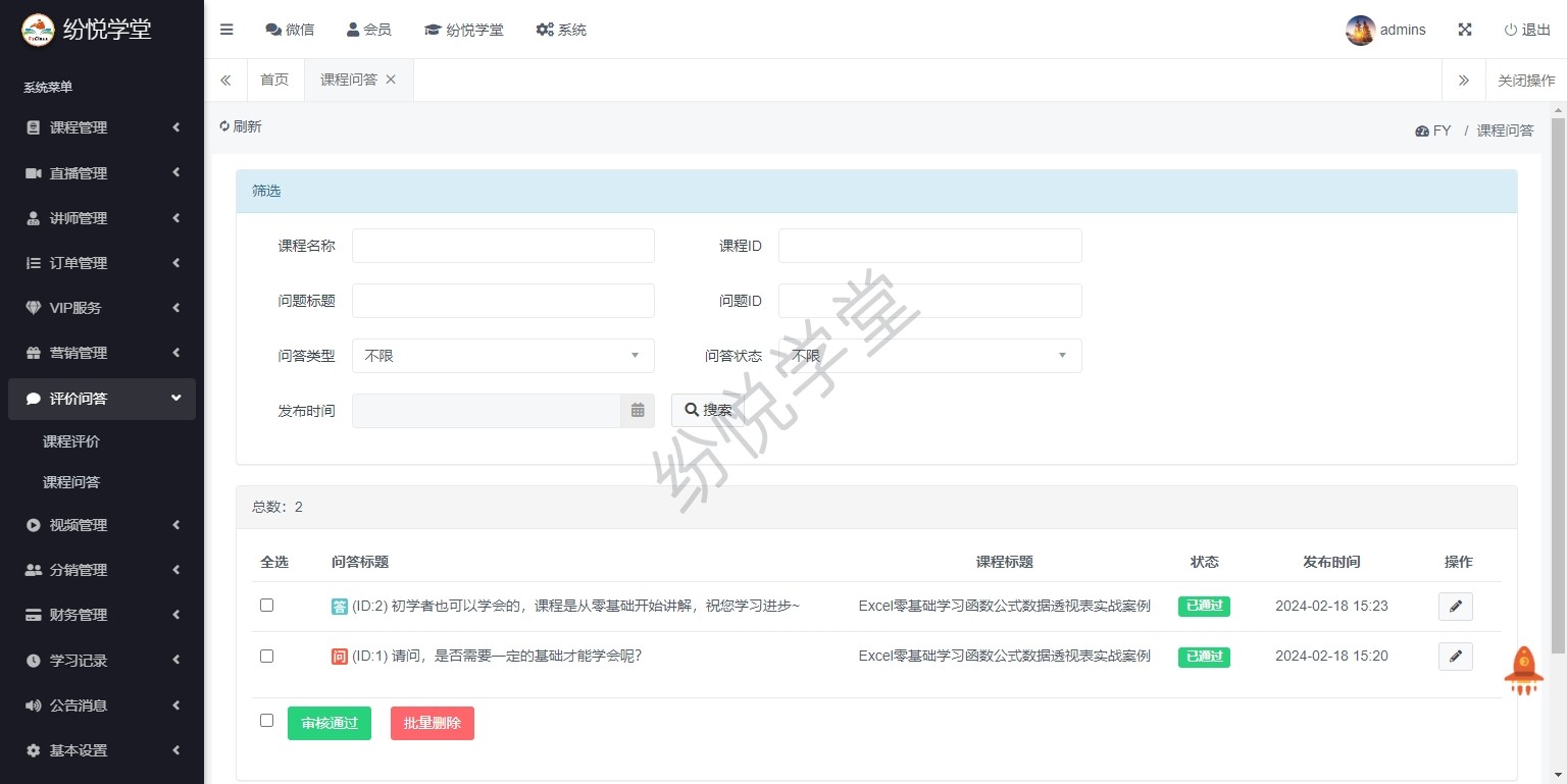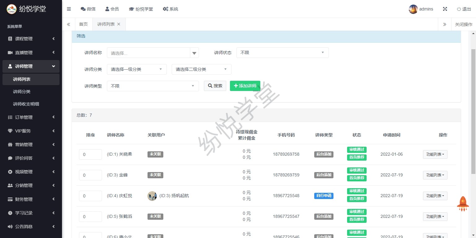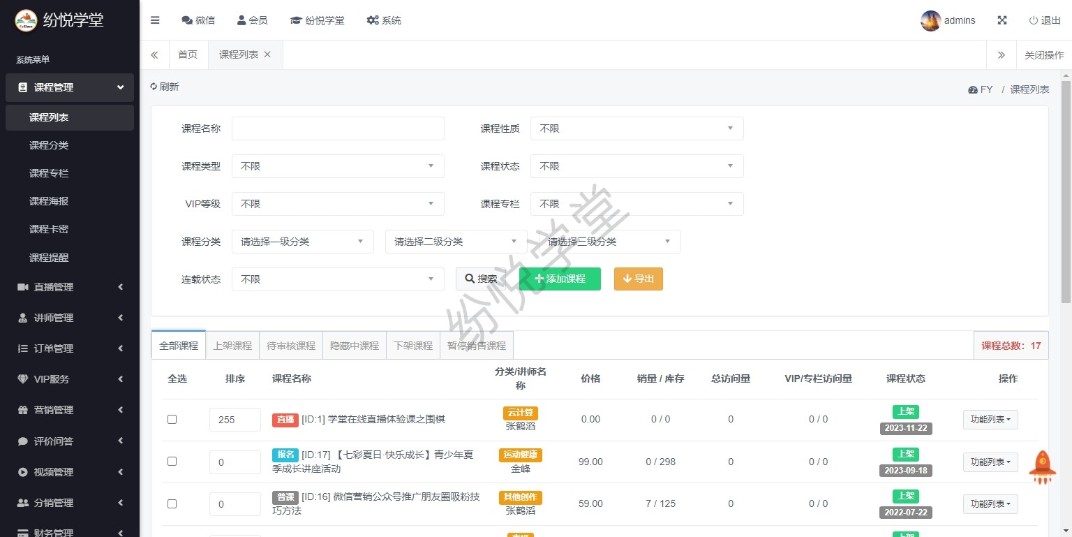 【系统正式上线,新增】课程管理、直播管理、讲师管理、订单管理、VIP服务、营销管理、评价问答、视频管理、分销管理、财务管理、学习记录、公告消息、基本设置、其他管理