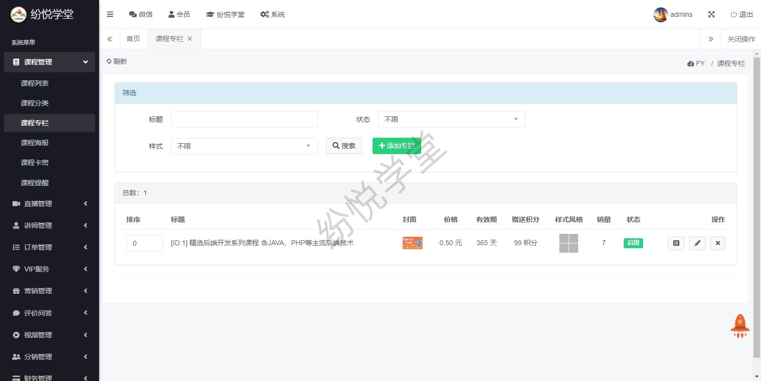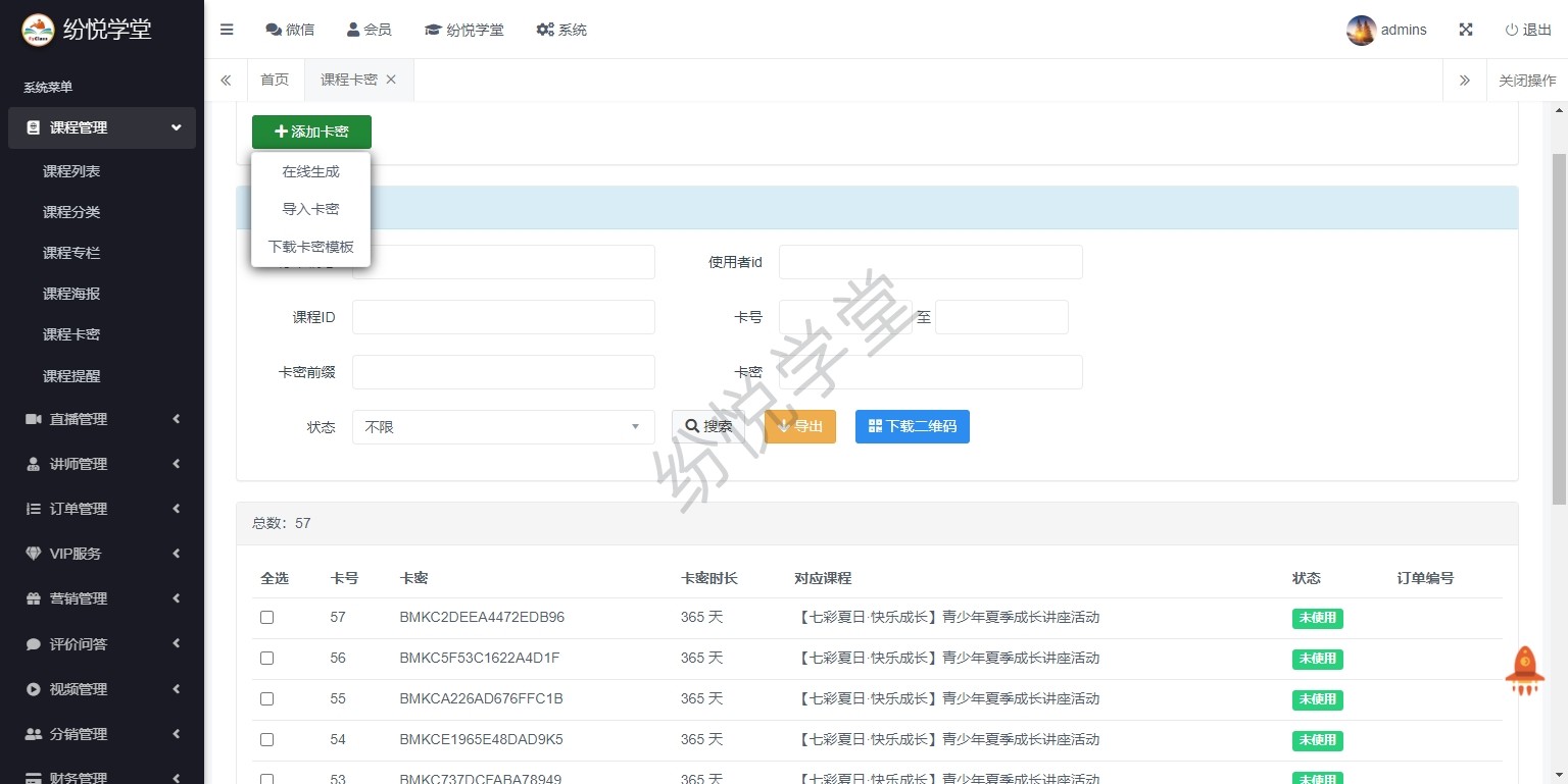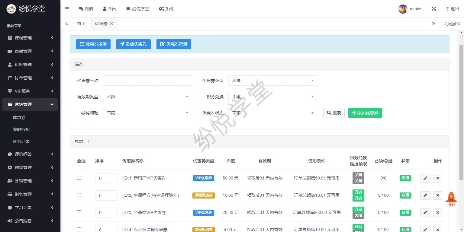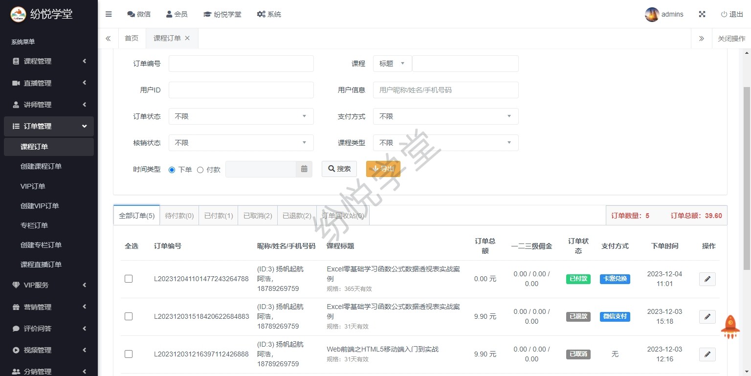 【系统正式上线,新增】课程管理、直播管理、讲师管理、订单管理、VIP服务、营销管理、评价问答、视频管理、分销管理、财务管理、学习记录、公告消息、基本设置、其他管理