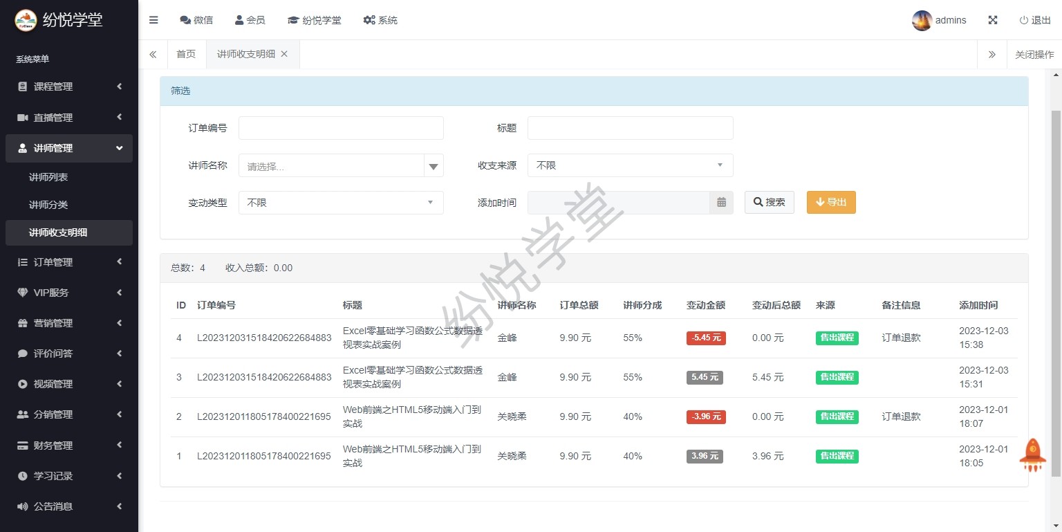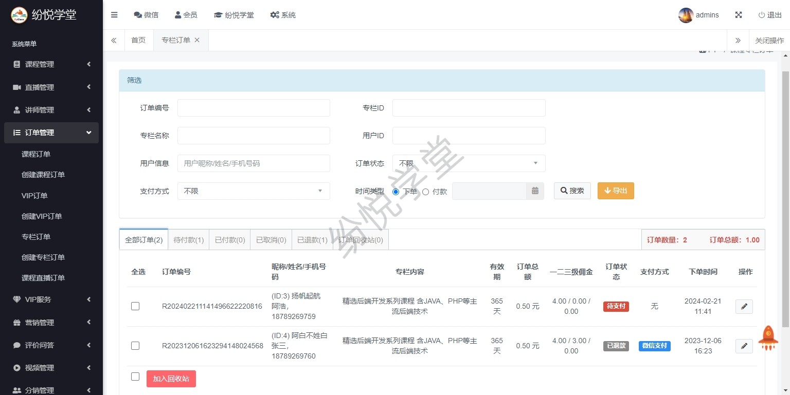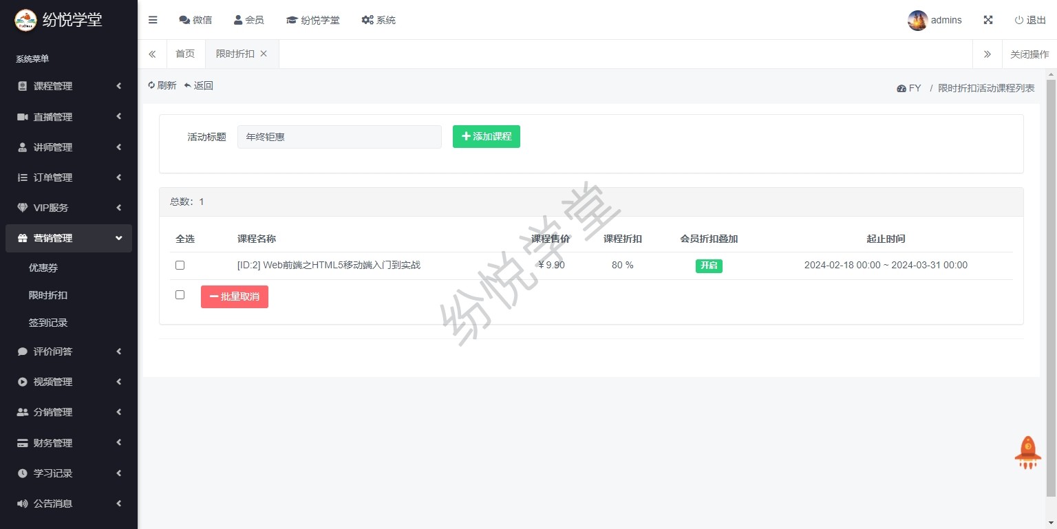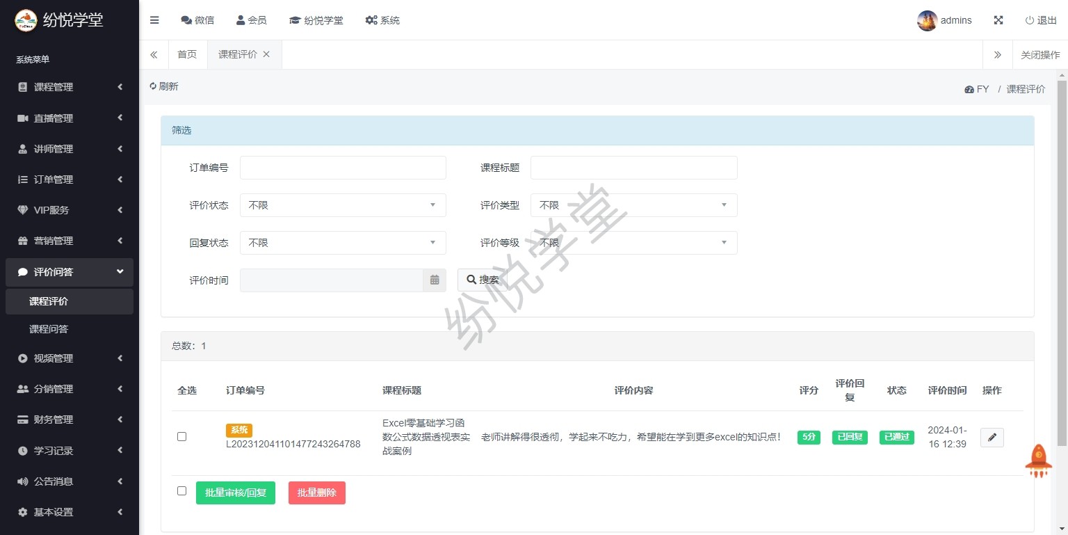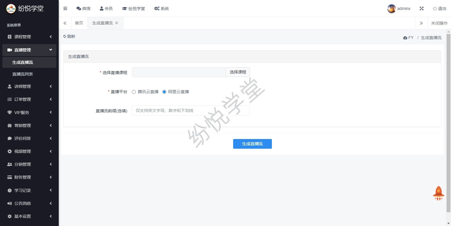 【系统正式上线,新增】课程管理、直播管理、讲师管理、订单管理、VIP服务、营销管理、评价问答、视频管理、分销管理、财务管理、学习记录、公告消息、基本设置、其他管理