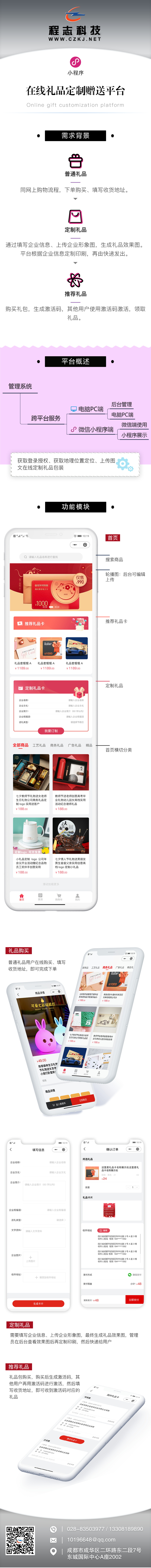 产品简介:平台分普通礼品、定制礼品、推荐礼品。普通礼品用户在线购买、填写收货地址,即可完成下单; 定制礼品,还需要填写企业信息、上传企业形象图,最终生成礼品效果图,管理员在后台查看效果图后再定制印刷,然后快递给用户; 推荐礼品为礼品包购买,购买后生成激活码,其他用户再用激活码进行激活,然后填写收货地址,即可收到激活码对应的礼品