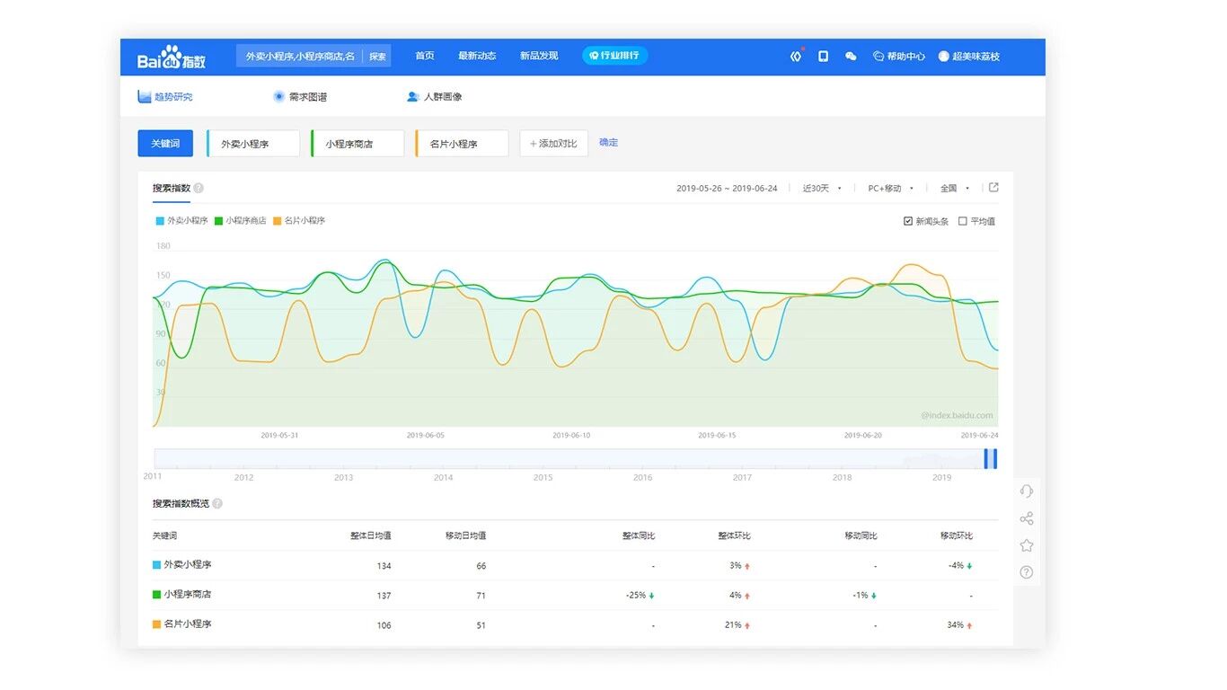 因为微信指数它推出较晚,不是完全基于主动搜索(还包含朋友圈等数据汇总)。作为前面主动搜索的百度数据或淘宝数据的补充较为严谨。就是三方数据都是统一的情况下,就是最真实的需求。尤其那种搜索曲线都同步的关键词。